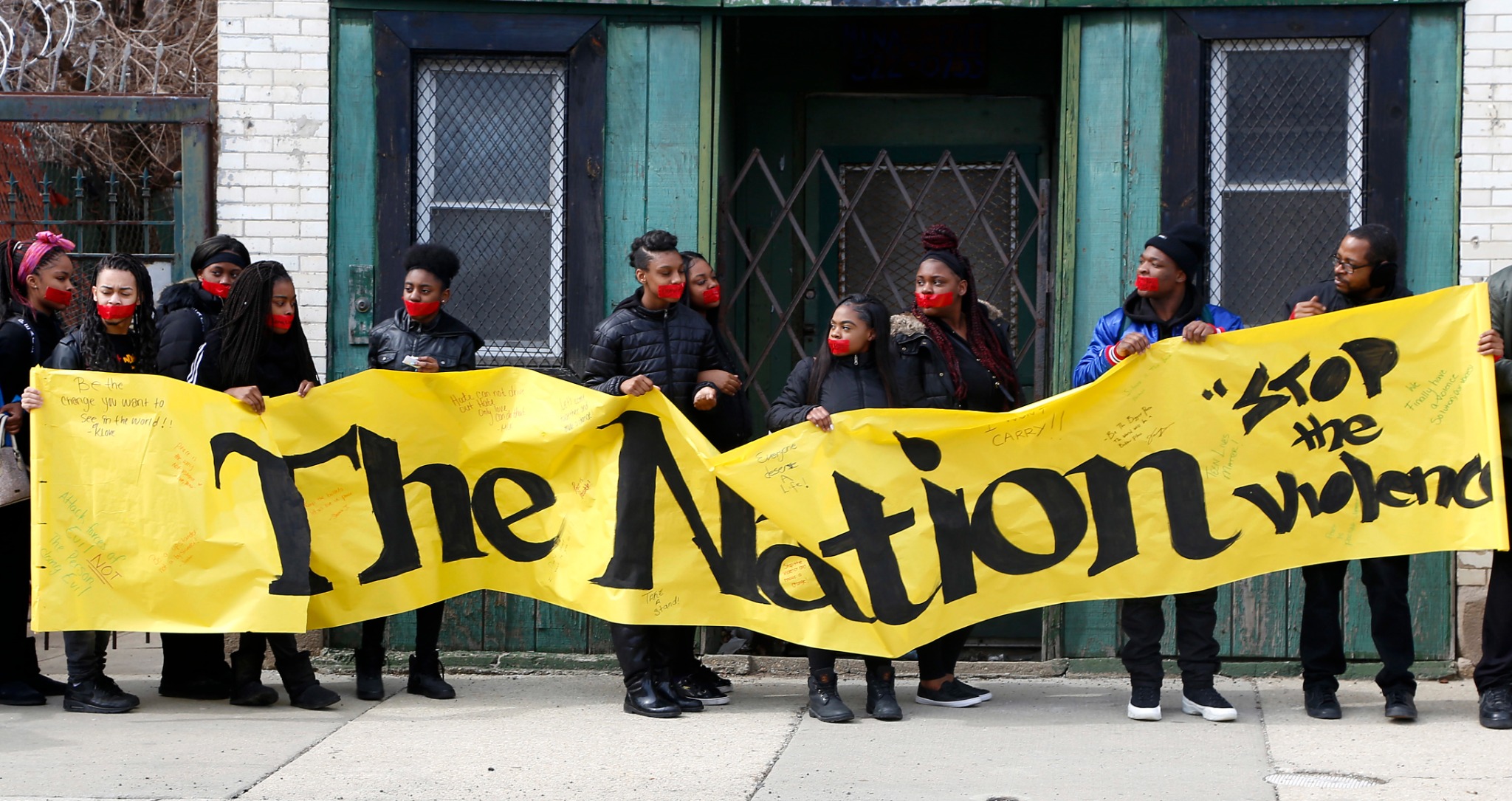 Alexis Willis, center, and other high school students from Chicago's North Lawndale neighborhood hold an anti-violence sign during a march in their neighborhood on Wednesday, March 14, 2018. Willis' 16-year-old cousin was shot and killed in Chicago three weeks after this demonstration. (AP Photo/Martha Irvine)